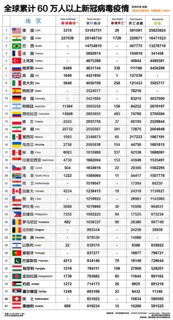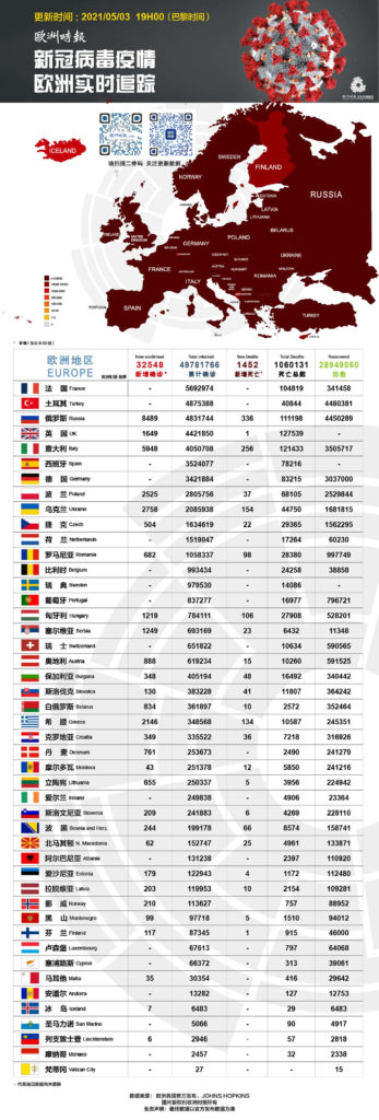 欧洲时报欧美新型冠状病毒肺炎疫情播报 新增病患32548(捷克504)累计病患49781766(捷克1634619)新增病亡1452(捷克22)病亡1060131(捷克29365)病愈28949060(捷克1562295) Categorised in: 今日世界, 今日捷克, 今日欧洲, 抗击新冠病毒