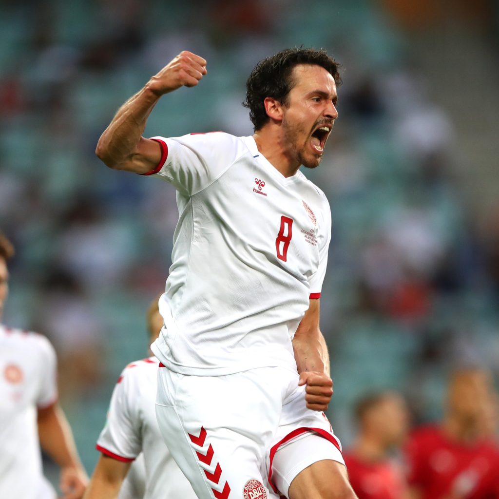 托马斯-德莱尼在一次错误的角球判罚后为丹麦队取得领先(5分钟)。