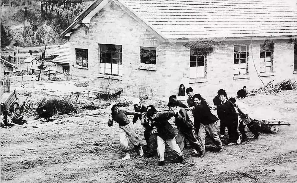 1959年,顾方舟(前排右一)在昆明与职工创建生物医学研究所,正在建设工地平整地基。
