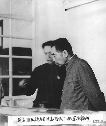 周恩来总理在顾方舟同志陪同下视察生物所。